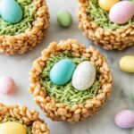 These adorable Rice Krispie Nests are a fun and festive treat perfect for springtime or Easter celebrations. Crispy, buttery marshmallow treats are shaped into nest forms and decorated with green-tinted shredded coconut and mini candy robin eggs for a delightful, crunchy, and sweet snack that kids and adults will love.