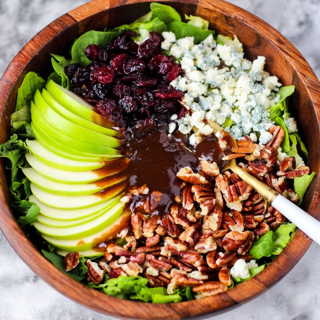 In a large bowl or on a serving platter, create a vibrant bed of mixed salad greens. Layer on the thin apple slices, crumbled bacon, Gorgonzola cheese, red onion, and toasted pecans or walnuts. Each layer adds a new texture and flavor, making every forkful dynamic and exciting.