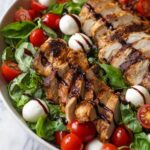 While the chicken rests, arrange your fresh mixed greens in a large serving platter or individual plates. Scatter the halved cherry tomatoes, fresh mozzarella balls, and fragrant basil leaves evenly over the greens, adding vibrant color and delicious layers of texture.