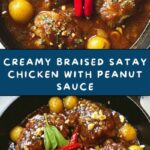 This Braised Nutty Satay Chicken is a rich and flavorful dish featuring tender chicken thighs simmered in a creamy peanut sauce with aromatic garlic, ginger, and a hint of chili. Perfectly balanced with lime juice and garnished with crushed peanuts and fresh cilantro, this Asian-inspired main course delivers comfort and a delicious nutty twist, ideal to serve alongside jasmine rice or steamed vegetables.