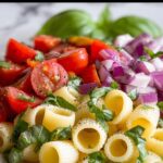 While the pasta cooks, halve those vibrant cherry tomatoes, finely dice the red onion, and mince the garlic. Toss them into a large bowl along with the chopped fresh basil. This combination builds the salad’s bright and savory base.