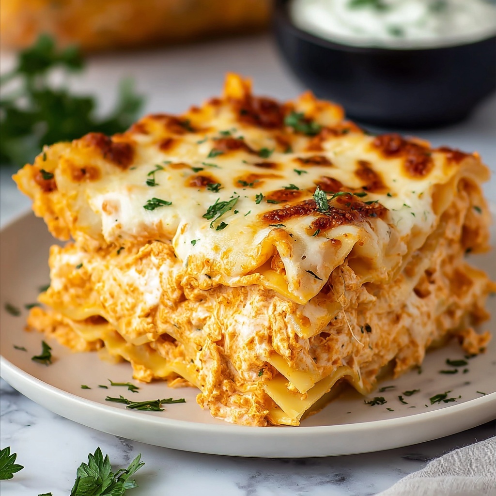 Once out of the oven, let your lasagna rest for 10-15 minutes. This step helps the layers settle, making it much easier to cut neat squares. Garnish with fresh parsley for a lovely pop of color and freshness if you like. Then plate up your Buffalo Chicken Lasagna Recipe and get ready for compliments!