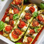Caprese Stuffed Zucchini Boats are a fresh and flavorful Italian-inspired dish featuring tender zucchini halves filled with a sautéed cherry tomato and garlic mixture, topped with creamy fresh mozzarella, Parmesan cheese, and finished with aromatic basil and a balsamic glaze drizzle. Perfect as a light main course or an impressive side, these baked zucchini boats combine classic Caprese ingredients in a low-carb, gluten-free preparation.