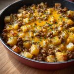 This Cheesy One Pan Meat Potato Skillet is a comforting and hearty dish combining savory ground beef, tender diced potatoes, sautéed onions, and garlic all cooked together in a single skillet. Finished with melted cheddar cheese, it’s an easy-to-make, flavorful meal perfect for busy weeknights or cozy dinners.