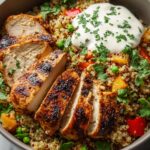 This Chicken Quinoa Bowl is a nutritious and flavorful Mediterranean-inspired dish featuring protein-packed chicken, fluffy quinoa, and fresh vegetables. Enhanced with zesty lemon juice and crumbled feta, it’s perfect for a healthy lunch or dinner that can be served warm or chilled.