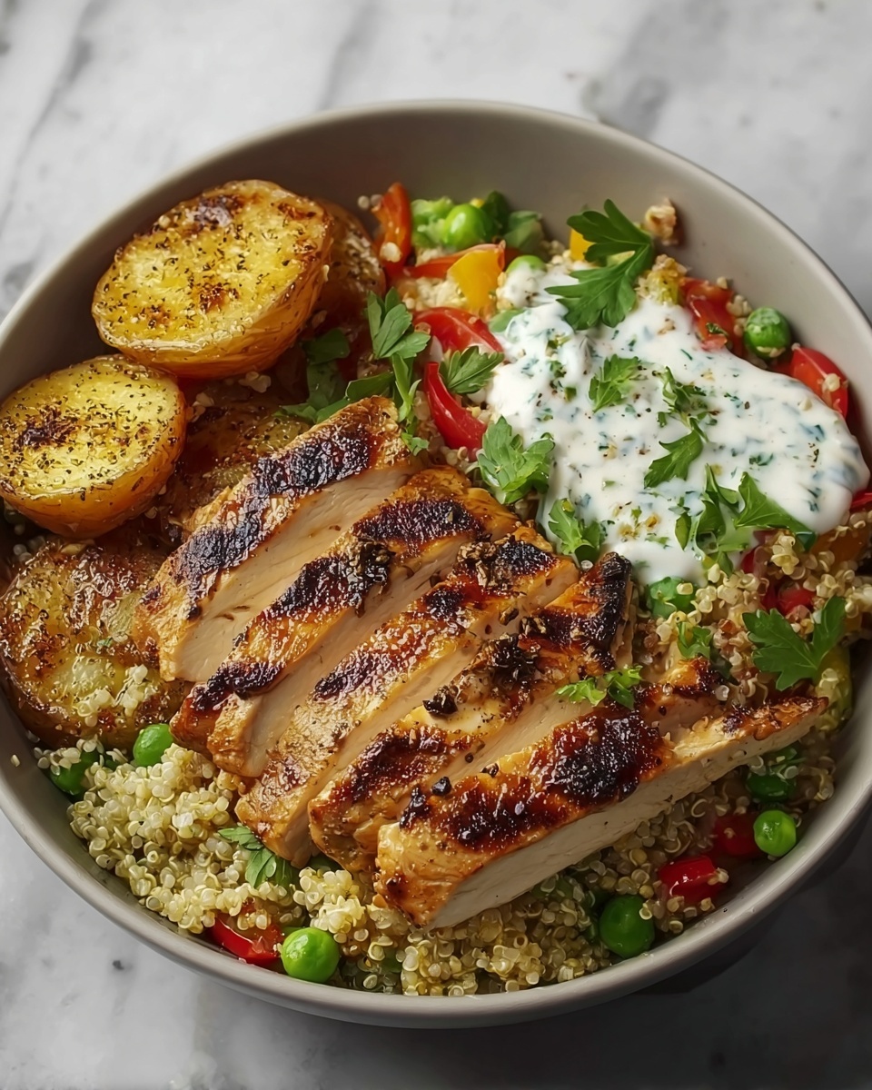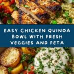 This Chicken Quinoa Bowl is a nutritious and flavorful meal featuring tender, spiced chicken breasts served over fluffy quinoa with fresh vegetables and a tangy homemade dressing. Perfect for a healthy lunch or dinner, it combines protein-rich quinoa and chicken with vibrant toppings like cherry tomatoes, cucumber, avocado, and optional feta cheese, all garnished with fresh cilantro.