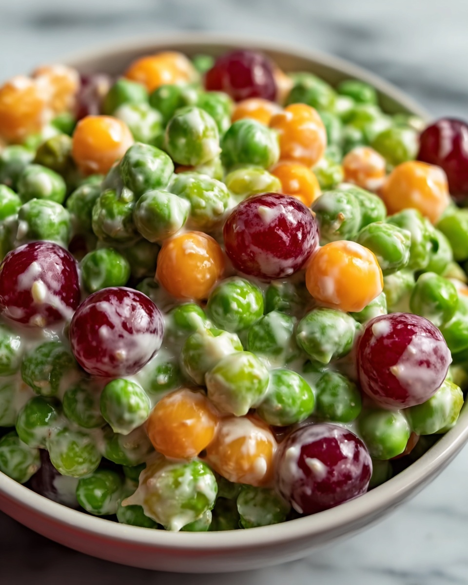 The beauty of this salad lies in how simple yet thoughtfully chosen its ingredients are. Each component plays a crucial role in balancing taste, texture, and color—from the pop of sweet peas to the richness of creamy mayo and tangy sour cream, making the salad both visually appealing and palate-pleasing.