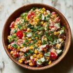 Cowboy Caviar is a vibrant, fresh, and zesty salad combining diced tomatoes, bell peppers, onions, jalapeños, avocado, corn, black beans, and cilantro, all tossed in a tangy lime and Italian dressing. This no-cook, quick-to-prepare recipe makes a perfect appetizer or side dish, ideal for gatherings, parties, or a healthy snack.