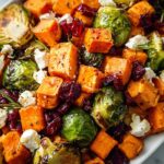 A vibrant and healthy salad featuring roasted butternut squash, Brussels sprouts, and sweet potatoes, all glazed with a tangy cranberry sauce and topped with creamy goat cheese and dried cranberries. Perfect as a hearty side dish or a festive vegetarian main.