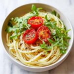 Gently fold the halved cherry tomatoes and fresh baby arugula into the pasta. The warmth of the noodles slightly softens the greens, easing them in without wilting. The tomatoes add bursts of juicy sweetness while the arugula brings a peppery kick that brightens the whole dish.
