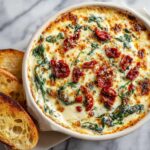 This Creamy Tuscan Dip is a flavorful, cheesy blend of cream cheese, sour cream, mozzarella, Parmesan, spinach, and sun-dried tomatoes, baked to bubbly perfection. Perfect as a warm appetizer served with sliced bread, baguette, or crackers, it’s a delicious way to enjoy rich Italian-inspired flavors in a creamy dip form.
