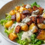 This Crispy Potato Caesar Salad is a unique twist on the classic Caesar salad, featuring oven-roasted, crispy russet potatoes combined with fresh romaine lettuce, creamy Caesar dressing, and a sprinkling of Parmesan cheese. The potatoes are seasoned with garlic powder, paprika, salt, and pepper, then roasted to golden perfection, adding a delightful crunch and heartiness to the refreshing salad. Perfect for a light lunch or as a side dish, this salad balances crispy textures with creamy, tangy flavors.