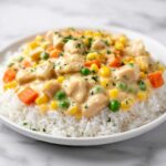 Once your crustless chicken pot pie is ready, serve it piping hot straight from the pot or ladle it over some fluffy cooked rice for an extra satisfying meal. It’s an inviting, nutritious dish that’s ready in just 35 minutes!