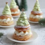 A festive and delightful recipe combining flaky shortbread stars with airy choux cream puffs filled with rich pistachio whipped cream, crafted to resemble charming Christmas trees perfect for holiday celebrations.
