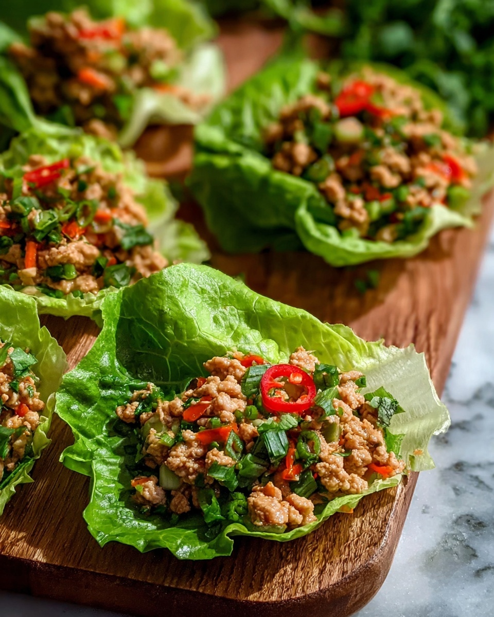 Light and fresh sides complement these Easy Chicken Larb Lettuce Wraps perfectly. Consider a simple cucumber salad dressed with rice vinegar and a sprinkle of toasted sesame seeds, or a bowl of jasmine rice to make the meal a bit more filling without overpowering the delicate flavors of the larb.
