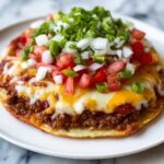 - Assemble the Pizzas: Spread a layer of refried beans evenly on each fried tortilla. Top with a generous portion of the seasoned beef, then sprinkle with shredded Colby Jack cheese. Cover this with another fried tortilla. Add taco sauce and more shredded cheese on top for added flavor and richness.