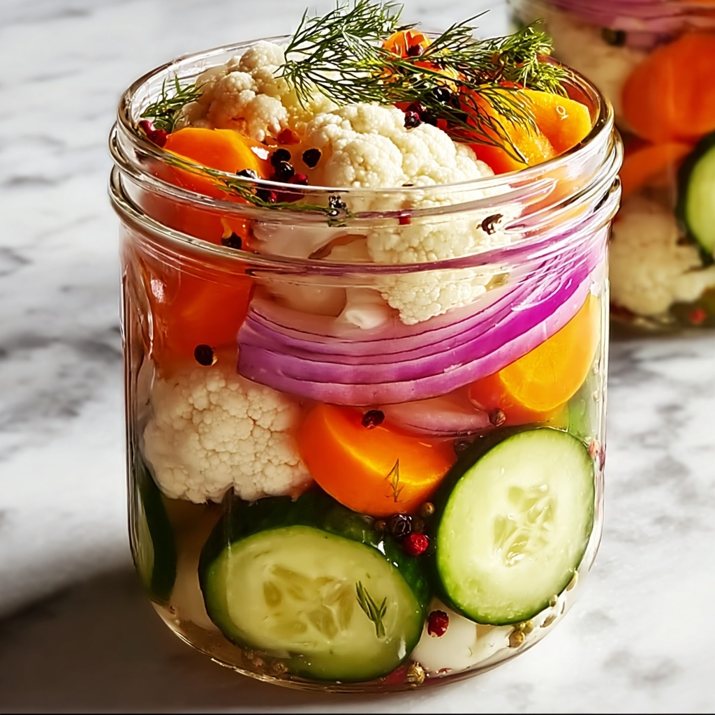 Easy Refrigerator Pickled Vegetables are a quick and delicious way to enjoy crisp, tangy, and flavorful vegetables without traditional canning. This recipe combines cucumbers, carrots, cauliflower, and bell peppers in a tangy vinegar brine infused with garlic, mustard seeds, dill, and spices for a refreshing side dish or condiment, perfect for adding a zesty crunch to any meal. Ready in just 24 hours and stored in the fridge, these pickles are customizable and ideal for anyone looking for a simple homemade pickle solution.