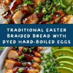 This festive braided bread with dyed hard-boiled eggs is a delightful and visually appealing treat perfect for Easter or any special occasion. The sweet, soft dough is enriched with butter, eggs, vanilla, and optional orange zest, braided into a circular loaf that encases colorful eggs. The bread is brushed with an egg wash for a shiny golden crust and baked until perfectly tender and aromatic.