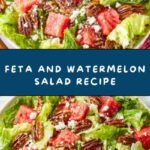 A refreshing and vibrant Feta and Watermelon Salad featuring crisp romaine lettuce, juicy watermelon, tangy feta cheese, and crunchy honey roasted pecans, all brought together with a zesty pepper jelly vinaigrette.