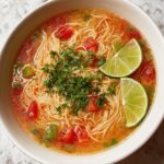 Fideo Mexican Noodle Soup is a comforting and flavorful traditional Mexican dish featuring toasted vermicelli noodles simmered in a savory tomato and chicken broth base with aromatic spices and fresh cilantro. It’s quick and easy to prepare, perfect for a satisfying meal served with fresh lime and optional toppings like avocado, jalapeños, and queso fresco.