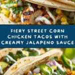 Fiery Street Corn Chicken Tacos combine tender, spice-marinated grilled chicken thighs with smoky grilled corn tossed in a flavorful salsa, topped with a creamy jalapeno-cashew sauce. These tacos are vibrant, packed with layers of fresh ingredients and bold spices, perfect for a zesty and satisfying meal.