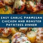 A flavorful Garlic Parmesan Chicken and Potatoes recipe featuring tender chicken breasts and crispy roasted potatoes coated in a savory blend of garlic, Parmesan cheese, and herbs, baked to perfection in the oven for an easy and delicious weeknight meal.