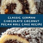 This German Chocolate Coconut Pecan Roll Cake is a deliciously moist rolled cake filled with a rich coconut-pecan filling and topped with fluffy whipped cream and optional chocolate drizzle. The cake combines the classic flavors of German chocolate cake with a luscious coconut and pecan custard filling, making it perfect for special occasions or indulgent desserts.