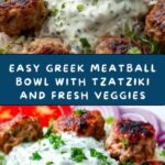 A flavorful Greek Meatball Bowl featuring tender oven-baked meatballs seasoned with traditional herbs and spices, served over fluffy rice with fresh veggies and a creamy homemade tzatziki sauce. This balanced and vibrant dish is perfect for a wholesome and delicious meal.