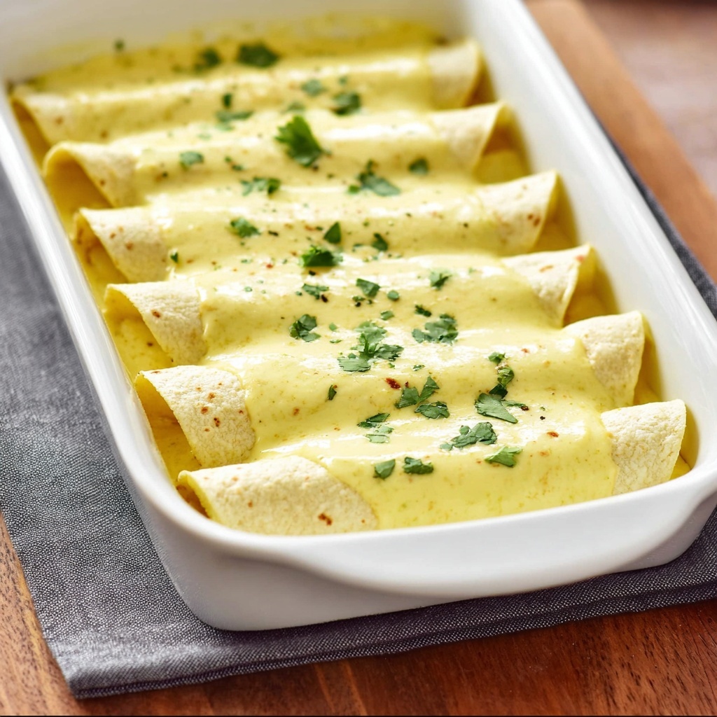 - Assemble Enchiladas: Spread a thin layer of green enchilada sauce on the bottom of a 9×13-inch baking dish. Spoon an even amount of the chicken mixture onto each tortilla, roll them tightly, and place each seam side down into the baking dish.
