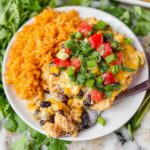 Fresh garnishes take this casserole over the top. Sprinkle chopped fresh cilantro for a bright, herbal contrast and add diced tomatoes for a juicy pop of color and freshness. A squeeze of lime or a dollop of sour cream also tastes terrific and adds a lovely tang.