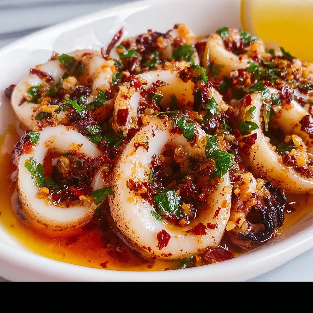 Fresh parsley is a classic garnish that adds a beautiful green contrast and mild herbal flavor complementing the garlic and smoky paprika. A few lemon wedges are a must—squeezing fresh lemon juice over the warm squid intensifies the freshness and lightens the smoky notes beautifully.