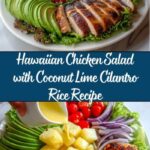 This Hawaiian Chicken Salad with Coconut Lime Cilantro Rice is a tropical-inspired dish featuring marinated and seared chicken breast paired with coconut-infused rice, fresh vegetables, and a tangy lime-cilantro dressing. The salad combines sweet caramelized pineapple and corn with crisp lettuce, avocado, and vibrant herbs, providing a refreshing and flavorful meal perfect for a quick, healthy lunch or light dinner.