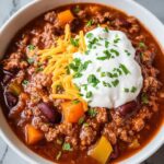 This homemade chili recipe is a hearty and flavorful dish perfect for a cozy meal. Made with ground beef, beans, tomatoes, and a blend of spices, it’s simmered to perfection to develop rich and deep flavors. Topped with shredded cheese, sour cream, and green onions, it’s a satisfying one-pot comfort food ideal for family dinners or casual gatherings.