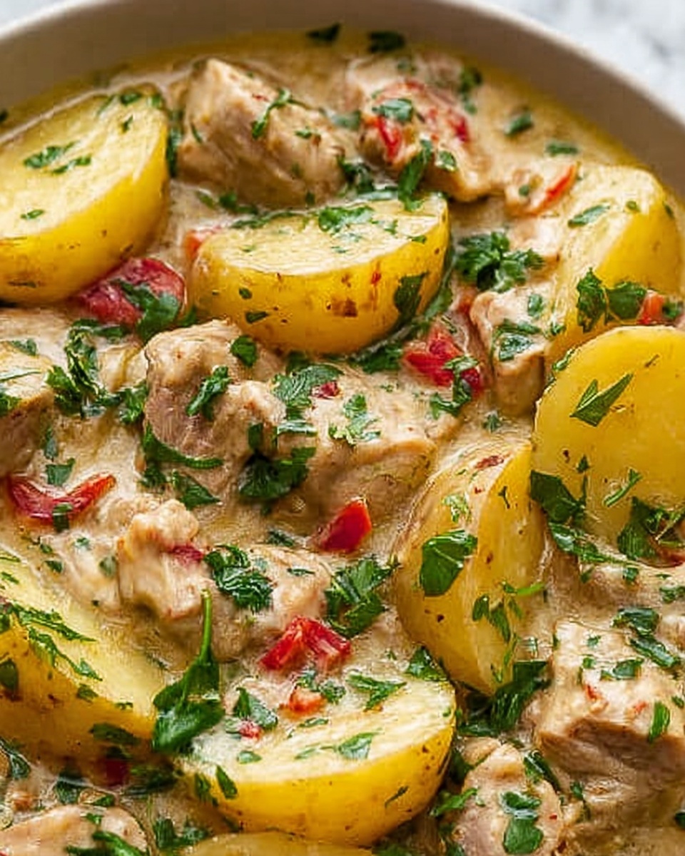 Reheat gently on the stovetop in a covered pan over low heat or in the microwave, sprinkled with a little extra water or broth if needed to preserve moisture. Avoid overheating to keep the chicken tender and the potatoes from drying out.