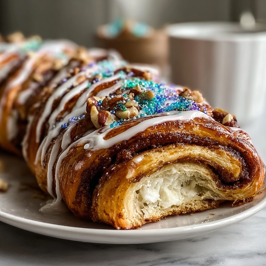 This King Cake Lemon Cream Cheese recipe combines the classic Mardi Gras King Cake with a refreshing lemon cream cheese filling. Soft, braided dough is filled with a tangy lemon cream cheese mixture, baked until golden, and then decorated with a sweet lemon glaze and vibrant purple, green, and gold sanding sugars to celebrate the festive tradition.