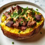This Loaded Baked Potato with Steak Bites recipe combines hearty, juicy steak chunks with fluffy baked potatoes and a rich Parmesan cream sauce, making it a perfect family favorite meal. The dish features crispy roasted russet potatoes seasoned with sea salt, flavorful Cajun-spiced steak bites sautéed in garlic butter, and a creamy parmesan sauce with a hint of heat from red pepper flakes. Finished with fresh parsley and lemon juice for brightness, this comforting meal is ideal for a satisfying dinner.