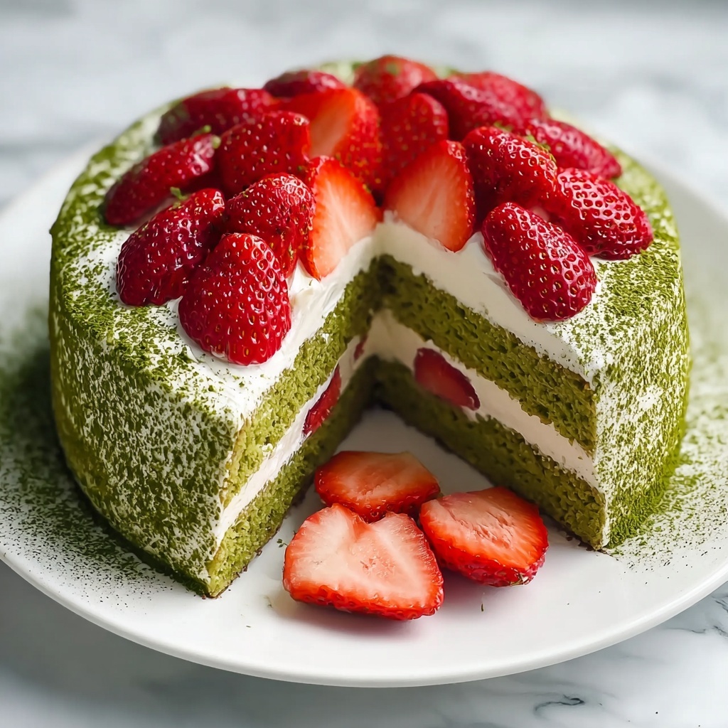 Slice this cake into petite squares and serve it on a rustic wooden board with some fresh strawberries and edible flowers for a charming dessert spread. Alternatively, create mini versions in cupcake form for parties, decorating each with a single strawberry slice and a touch of matcha dust.