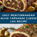 A vibrant Mediterranean Olive Tapenade Cheese Log featuring a blend of creamy goat cheese, Kalamata and green olives, capers, and fresh herbs, coated with a flavorful olive tapenade. Perfect as an elegant appetizer or party snack served with toasted baguette slices or crackers.