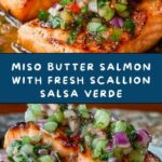 A flavorful and elegant Miso Butter Salmon recipe paired with a vibrant Sizzled Scallion Salsa Verde. The salmon is pan-seared to a golden brown and glazed with a creamy miso butter mixture, complemented by a fresh and mildly spicy salsa verde made with browned scallions, herbs, and zesty citrus. Perfect for a quick and impressive weeknight dinner or special occasion.