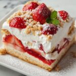 A delightful no-bake strawberry cheesecake lasagna that layers graham cracker crust, creamy cheesecake filling, instant cheesecake pudding, fresh strawberries, and whipped topping for a refreshing and easy-to-make dessert perfect for summer or any occasion.
