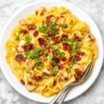 Finish the dish by sprinkling the cooked chopped bacon and fresh chopped green onions over the top. These final touches bring in bold smoky crunch and a pop of fresh color that make every forkful exciting.