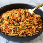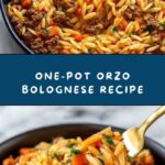 This One-Pot Orzo Bolognese recipe is a hearty and comforting Italian-inspired dish that combines tender orzo pasta with a rich, flavorful ground beef and vegetable sauce. Perfect for a quick weeknight meal, it’s cooked entirely in one pot for easy preparation and minimal cleanup. The dish features classic aromatic vegetables, savory herbs, and a creamy finish with Parmesan cheese, garnished with fresh basil for a bright touch.