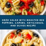 This Orzo Salad with Roasted Red Peppers, Capers, Artichokes, and Olives Recipe tastes best when made a few hours ahead to allow flavors to meld. You can also prepare it up to a day in advance and refrigerate it before serving.