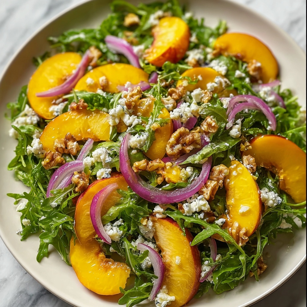 A refreshing and vibrant Peach Arugula Salad combining peppery arugula with sweet ripe peaches, creamy goat cheese, crunchy toasted nuts, and a tangy honey-balsamic dressing for a perfect light meal or side dish.