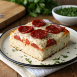 - Assemble Layers: Divide the dough in half. Drop spoonfuls of half the dough evenly onto the bottom of the prepared baking dish. Drizzle half of the pizza sauce over the dough. Layer half of the sliced pepperoni and half of the shredded mozzarella cheese on top. Then repeat the layers with the remaining dough, pizza sauce, pepperoni, and cheese.