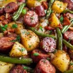 A hearty and flavorful one-pan dish featuring sautéed baby potatoes, fresh green beans, and smoky sliced sausage. This easy American skillet meal combines tender vegetables with richly browned sausage, enhanced by garlic, onion, and paprika, perfect for a satisfying gluten-free main course.