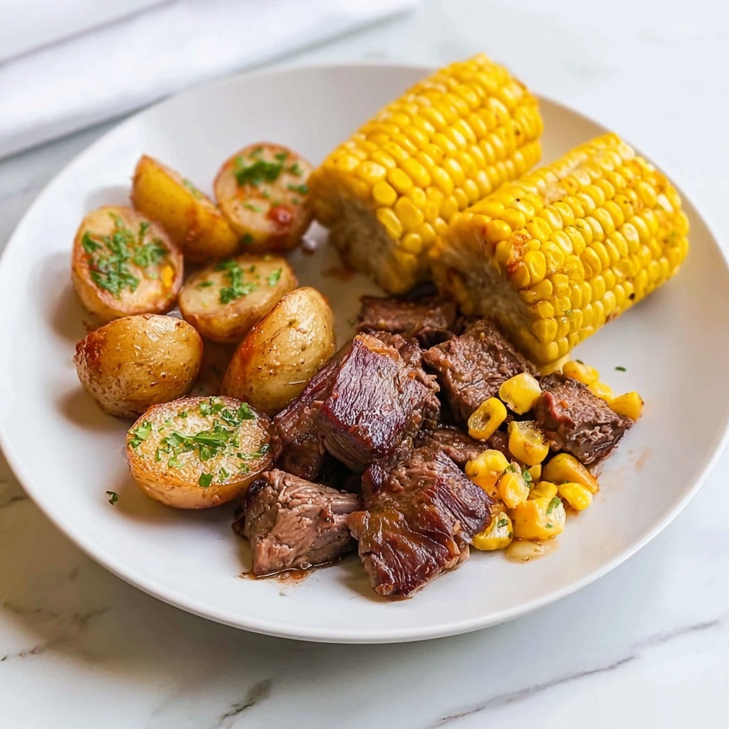 For a fun twist, try serving this recipe family-style right from the slow cooker at the table — it’s warm and inviting and encourages everyone to dig in and enjoy directly. Alternatively, plate it neatly with the steak piled in the center, potatoes fanned out, and corn arranged artistically on the side. A drizzle of extra butter sauce over the plate finishes it beautifully.