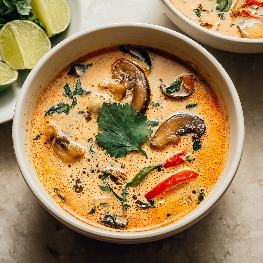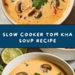 Slow Cooker Tom Kha Soup is a fragrant and creamy Thai coconut chicken soup made with aromatic lemongrass, kaffir lime leaves, ginger, and red curry paste. This comforting soup features tender chicken thighs simmered slowly with mushrooms and a rich coconut milk broth, enhanced by fresh lime juice and cilantro for a perfect balance of tangy and savory flavors. Ideal for an easy, hands-off meal packed with authentic Thai taste.