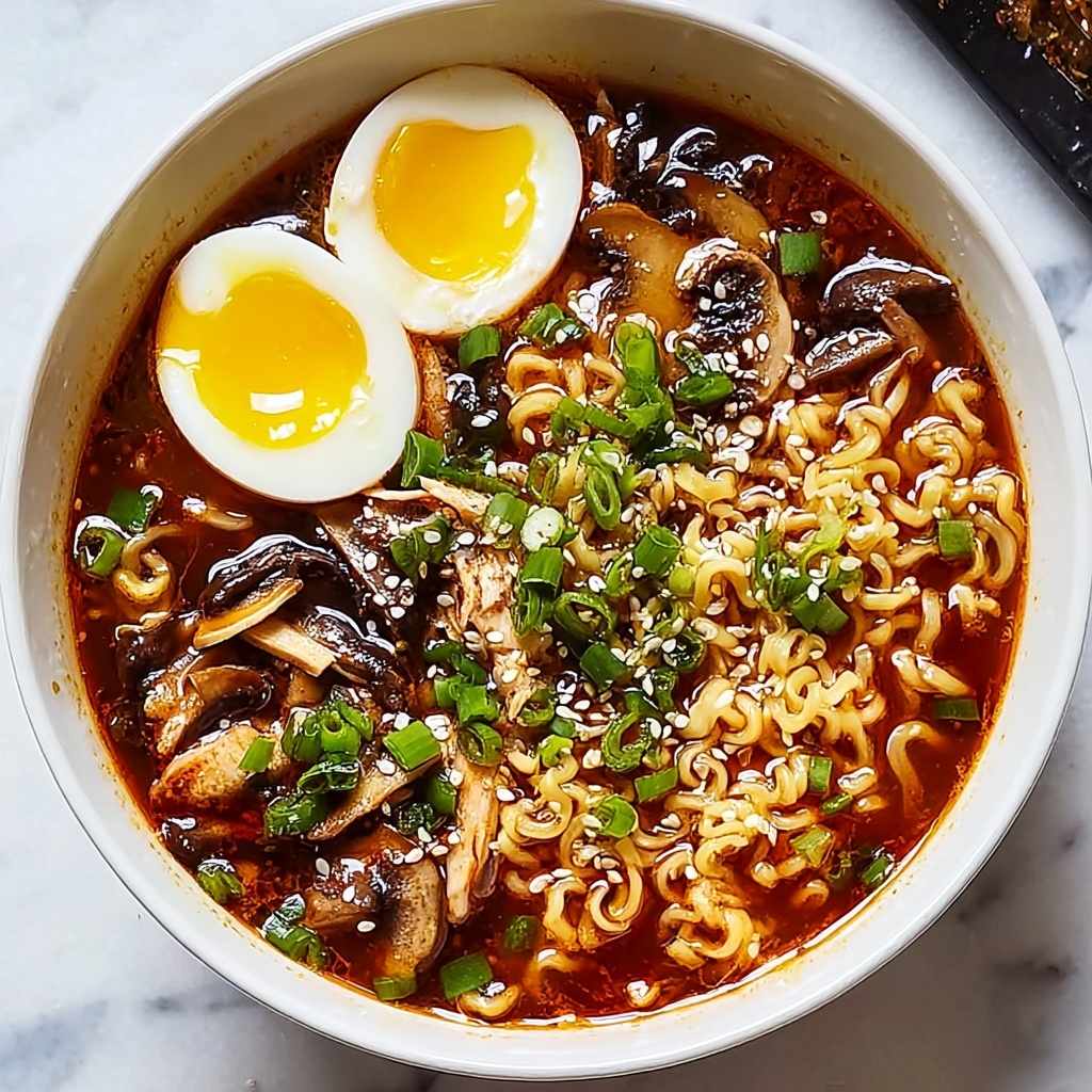 Drizzle the chili sesame oil over each bowl generously, then sprinkle with sesame seeds if desired. Serve immediately while hot, and prepare to enjoy an extraordinary bowl of Spicy Chicken Ramen Soup with Soft-Boiled Eggs Recipe that feels like a warm hug in every spoonful.