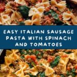 A hearty and flavorful Tomato Spinach Sausage Pasta combining savory Italian sausage with fresh spinach and cherry tomatoes in a spicy tomato sauce, served over tender farfalle pasta. Quick and easy to prepare, perfect for a satisfying weeknight dinner.